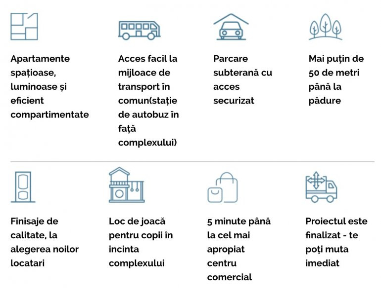 Ansamblul Rezidențial este format din 4 blocuri care găzduiesc un total de 144 de apartamente și 200 de parcări, dar care ocupă doar 26% din suprafață întregului teren. Pe restul terenului în suprafață de 3700mp este restricționat traficului auto și este folosit de locatari pentru plimbare, socializare sau orice altă activitate de petrecere a timpului în aer liber sau, dacă au copii, aceștia îi pot plimbă sau vedea cum se joacă linișțiți și în siguranță în curtea interioară a ansamblului.