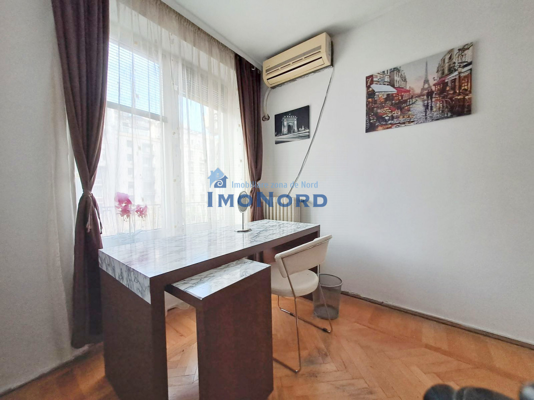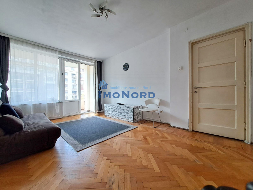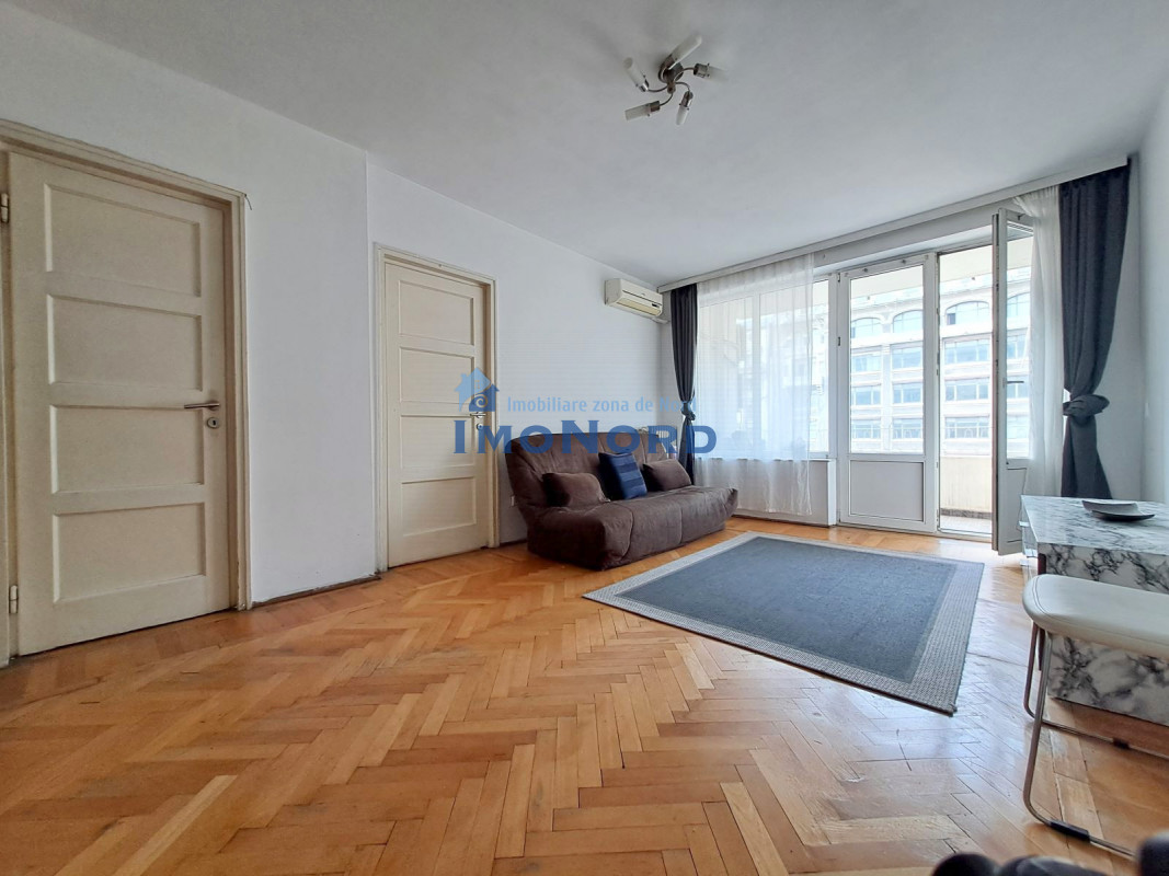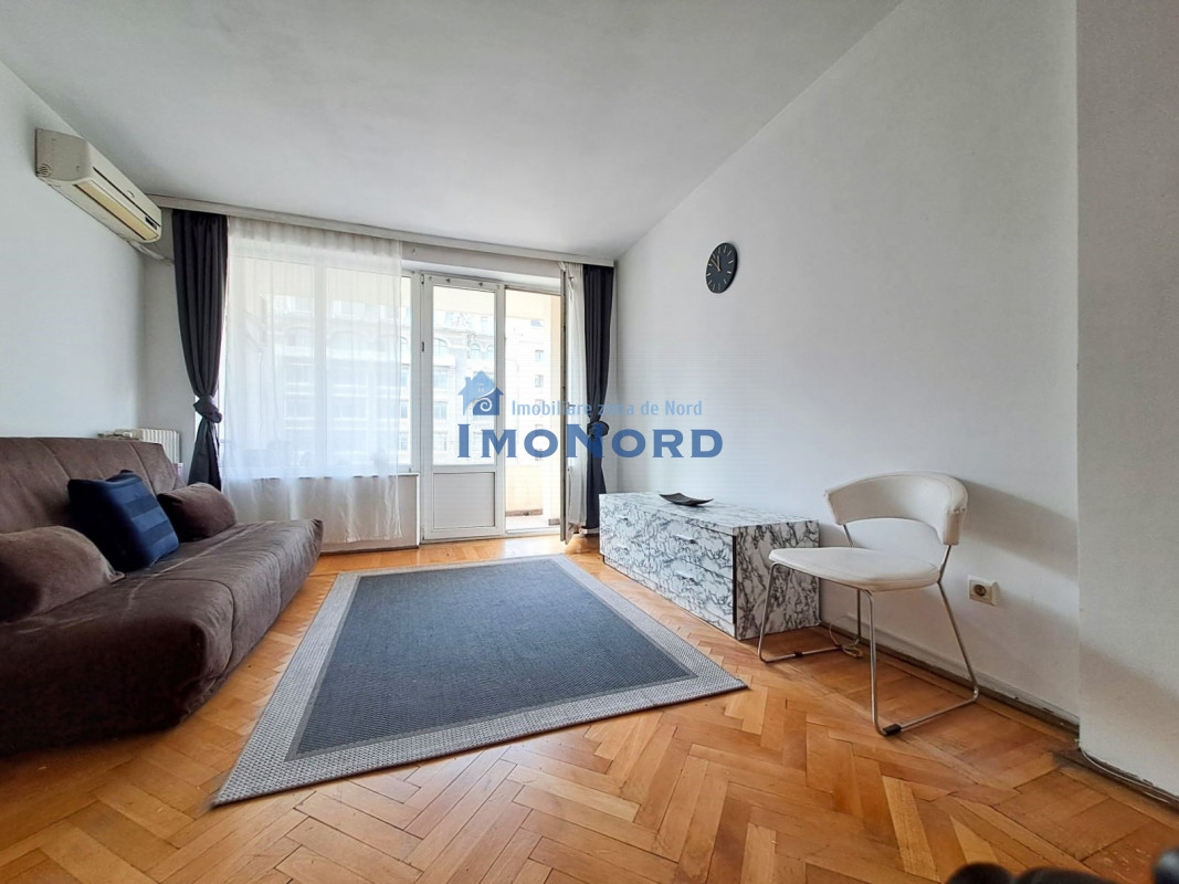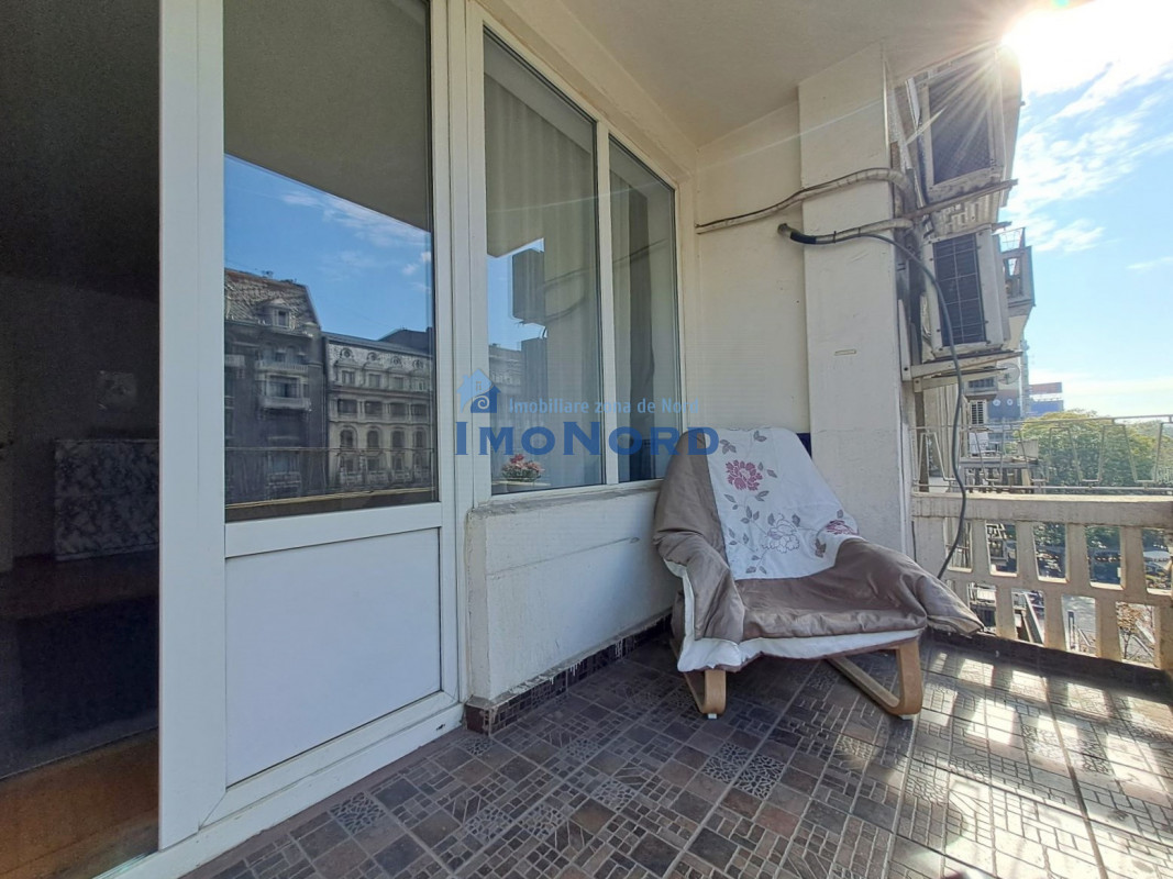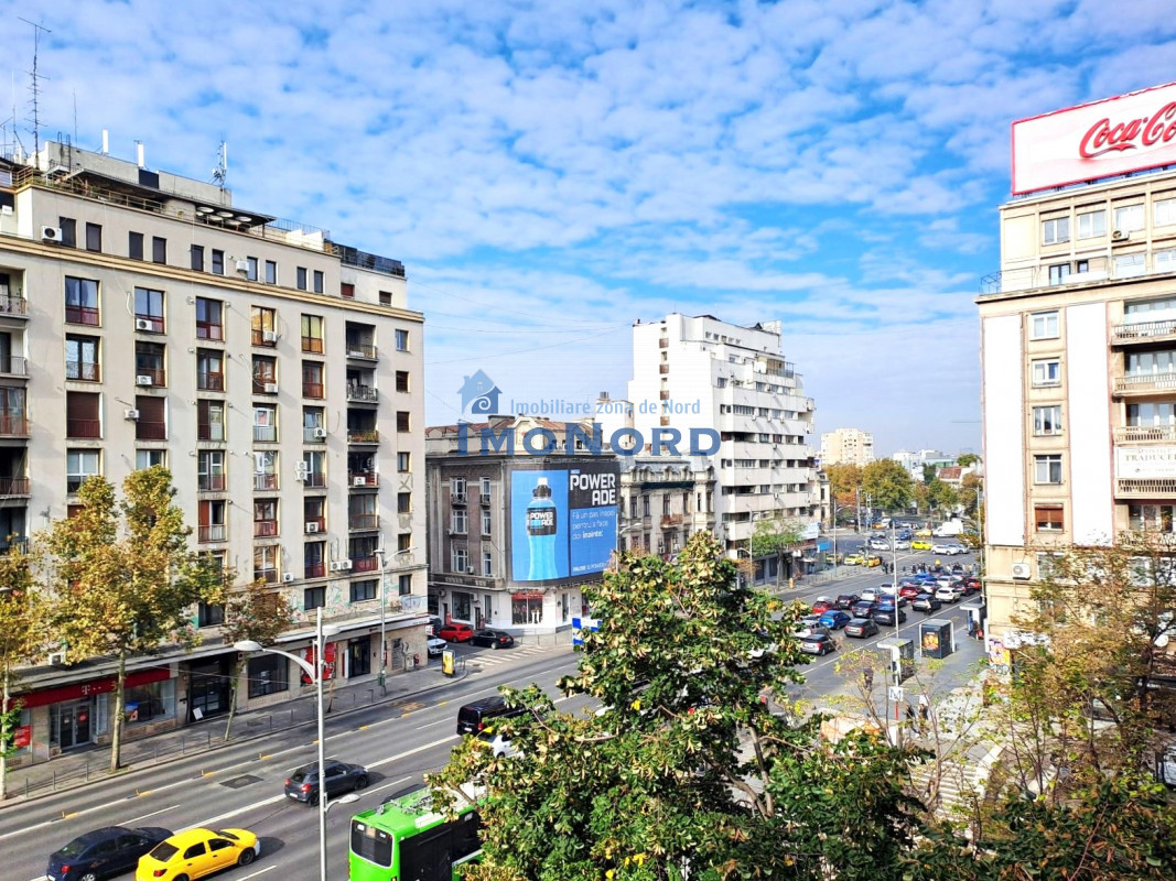 Apartamentul se afla pe bulevardul Magheru - Piata Romana, este situat la etaj inferior, semidecomandat, se compune din hol intrare, bucatarie, camera de zi, hol intermediar, dormitor, baie, spatii depozitare si un balcon amplu orientat catre bulevard.