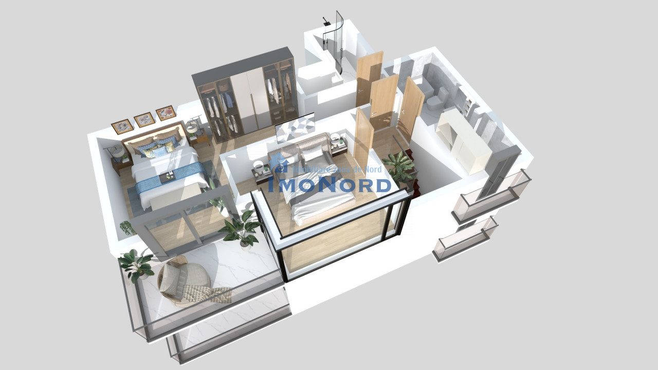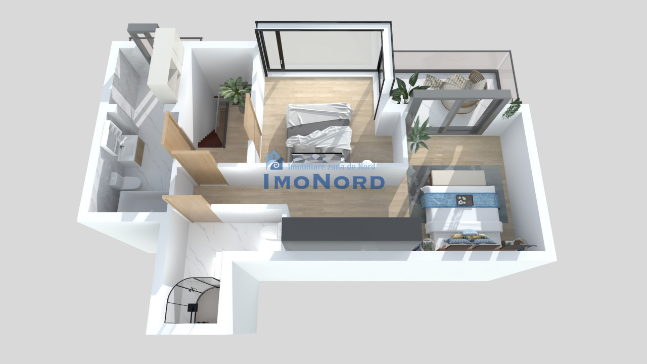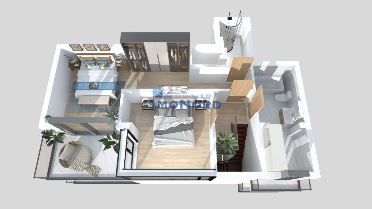- la al 2-lea nivel avem 2 dormitoare, primul este dormitorul matrimonial care are dressing si baie proprie; al 2l-ea dormitor are acces pe terasa, iar pe hol avem o alta baie. Ambele dormitoare au acces pe o terasa de 7,5mp cu expunere catre Sud.