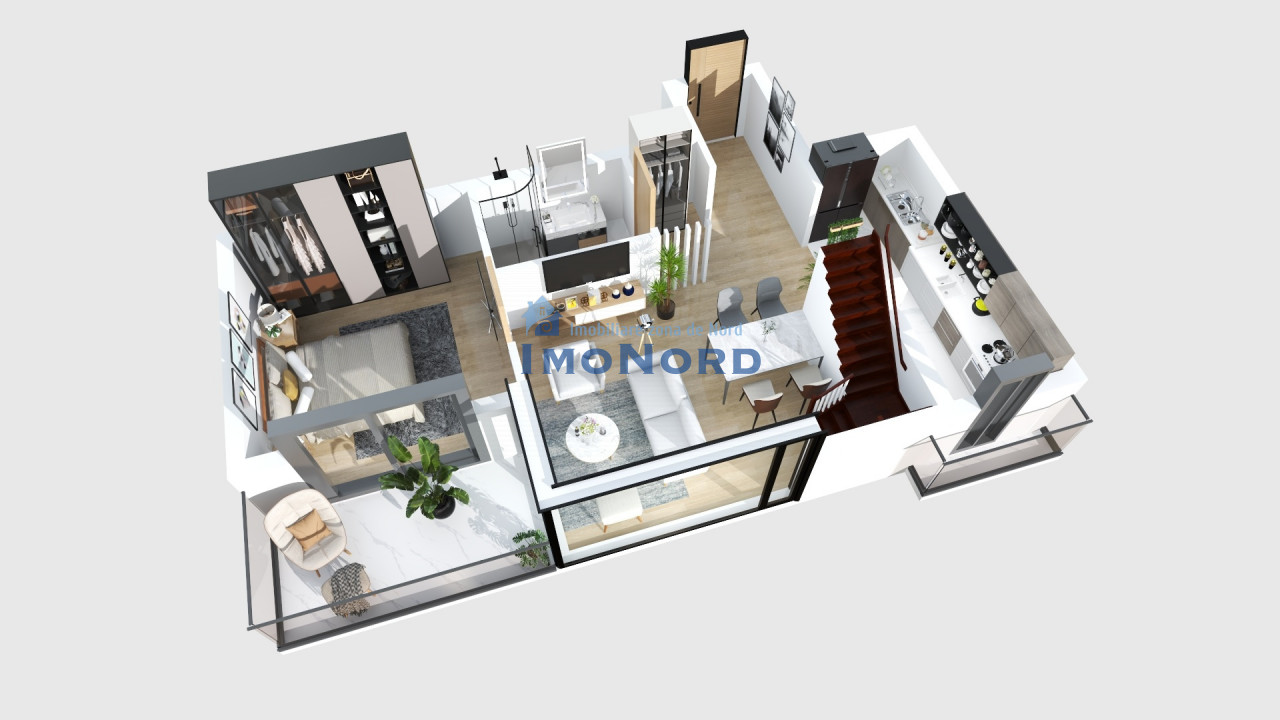 - la primul nivel, in zona de intrare un hol cu zona de cuier si o debara cu spatiul masinii de spalat rufe incorporat; Zona de zi este compusa dintr-un living spatios si o bucatarie deschisa catre acesta, dar care se poate si separa. Tot din zona de zi avem acces pe terasa de 7,5mp, acesta fiind expus catre Sud, un loc ideal pentru a te relaxa; mai avem un dormitor si o baie.