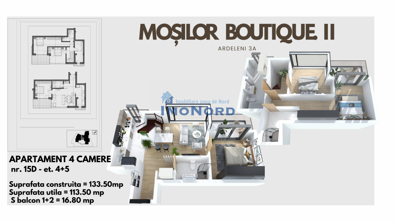 Va prezentam spre vanzare un apartament duplex situat la etajele 4+5 cu 4 camere, in zona Dacia-Mosilor, intr-un bloc nou.